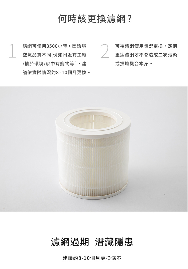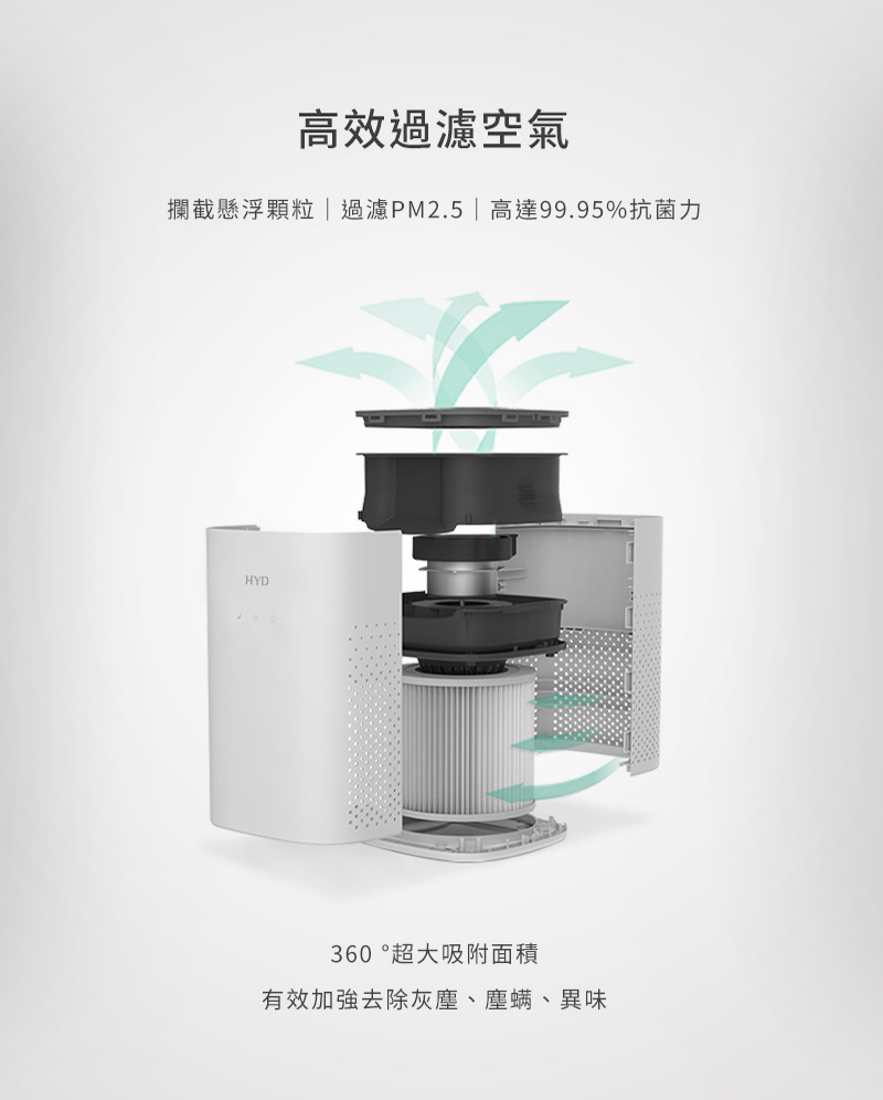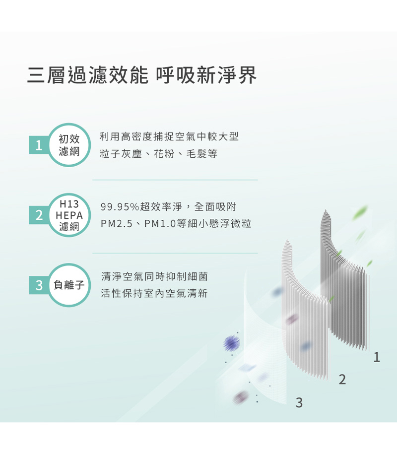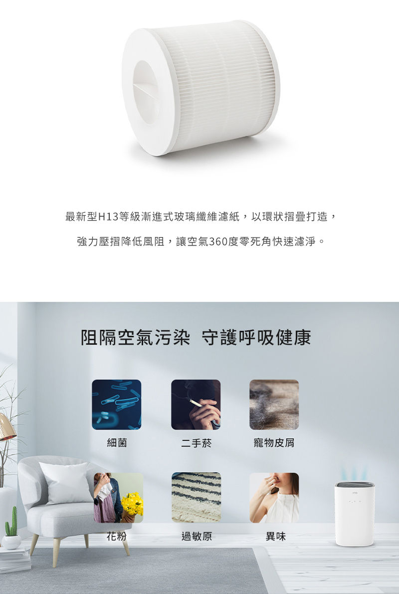 最新型H13等級漸進式玻璃纖維濾紙,以環狀摺疊打造,強力壓摺降低風阻,讓空氣360度零死角快速濾淨。