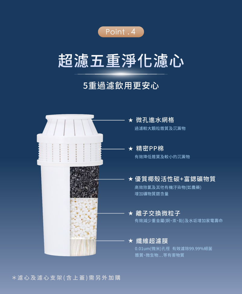 4. 有效濾除99.99%細菌、雜質、微生物...等有害物質。